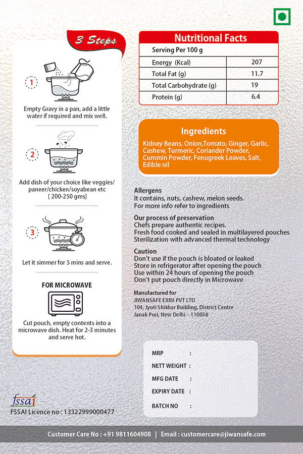 Rajma Masala Ingredients Kidney Beans, Onion,Tomato, Ginger, Garlic, Cashew, Turmeric, Coriander Powder, Cummin Powder, Fenugreek Leaves, Salt, Edible oil